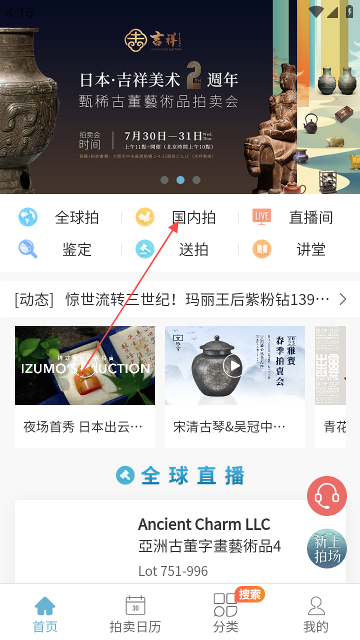 2、进入首页,点【国内拍】,进国内拍卖频道。