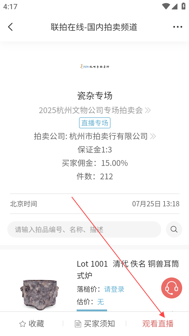 4、进拍卖专场详情页,点底部【观看直播】,即可观看拍卖直播。