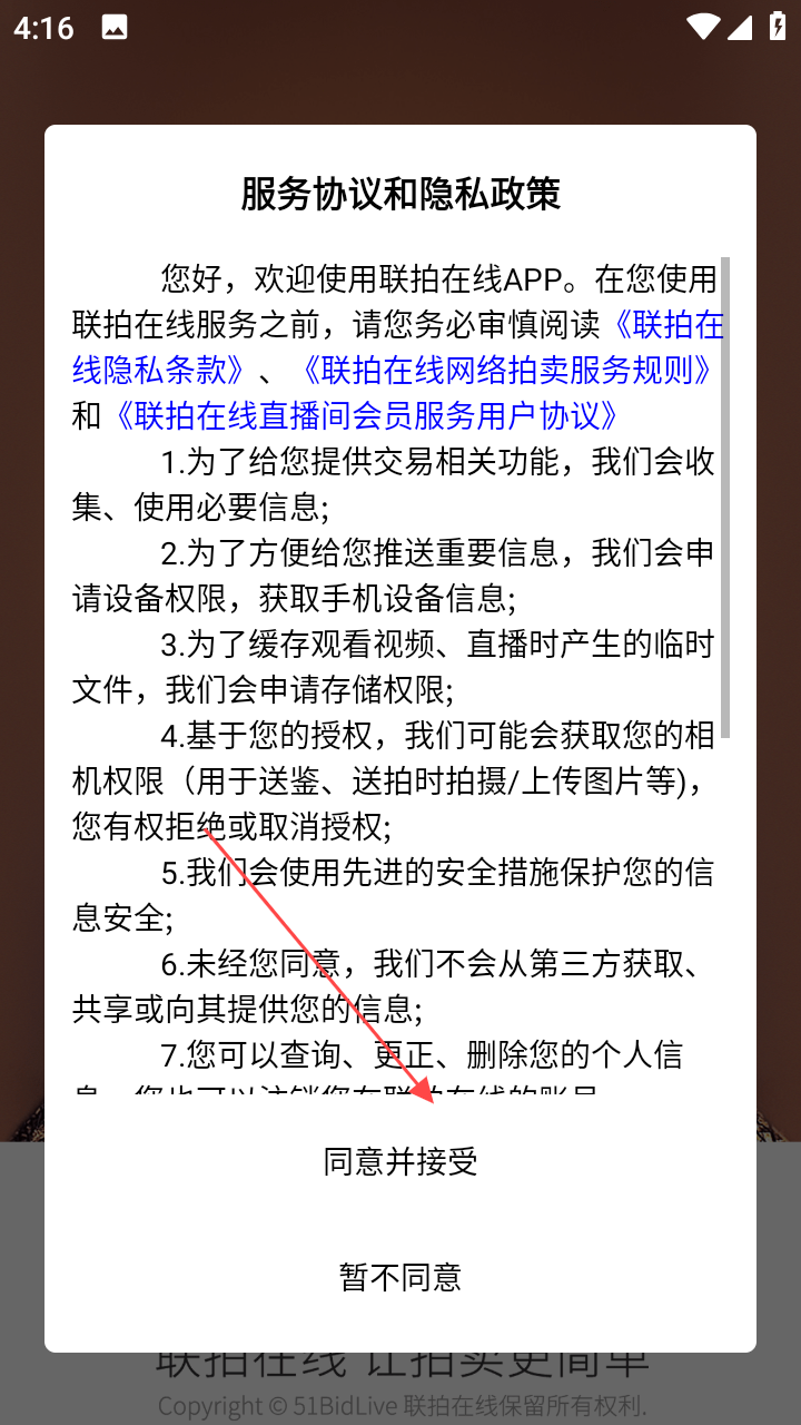 1、首次打开联拍在线,弹出【服务协议和隐私政策】,点【同意并接受】。