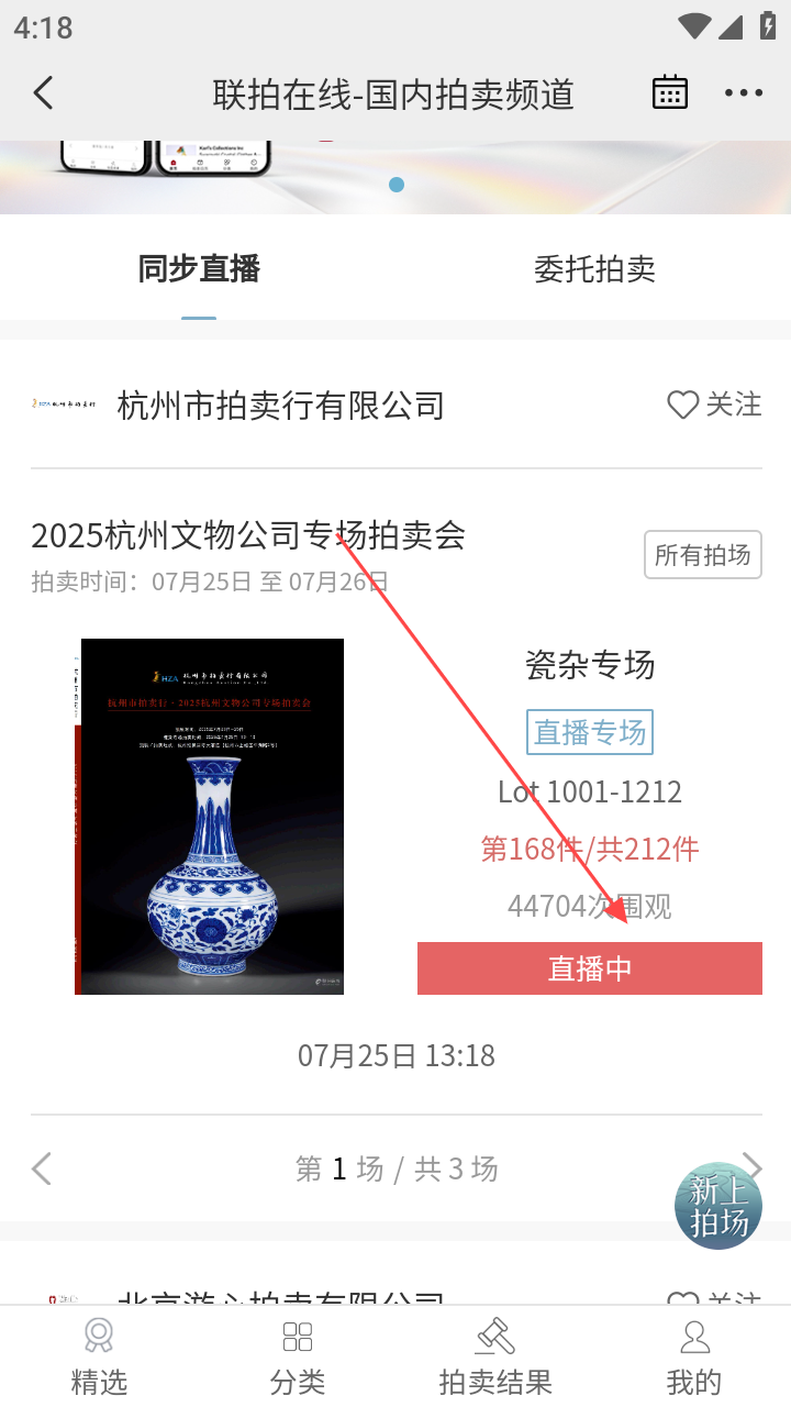 3、在国内拍卖频道,找直播中的拍卖会,点对应直播中入口。