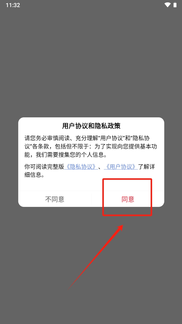 1、阅读并同意《用户协议和隐私政策》,点击“同意”按钮继续。