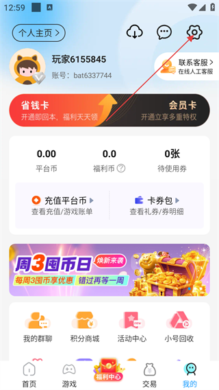 2、在【我的】界面,点击右上角设置图标,进入账户安全页面。