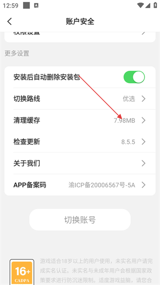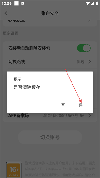 3、在账户安全页面,点击【清理缓存】选项,弹出“是否清除缓存”提示框。