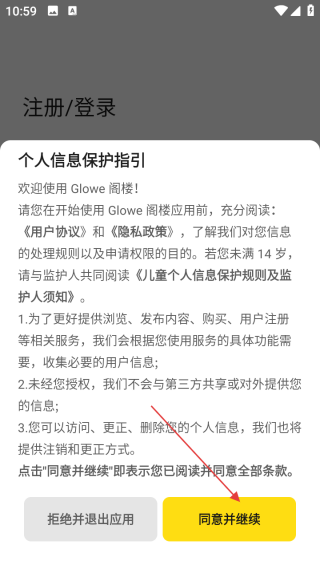 1、打开应用查看个人信息保护指引点击同意并继续。