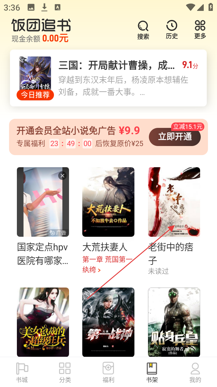 1、在饭团追书首页,点击感兴趣的书籍,如《老街中的痞子》,可进入书籍阅读页面。