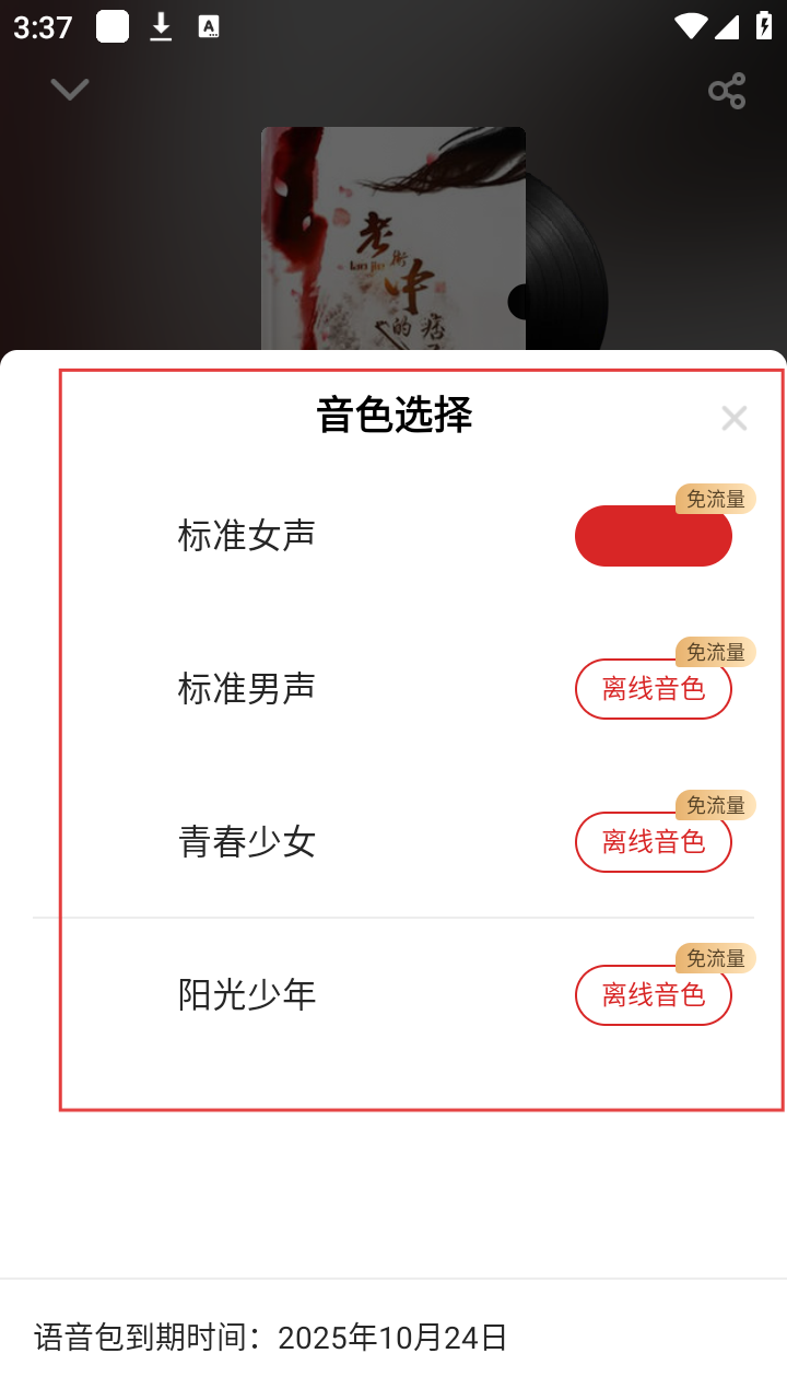4、在音色选择页面,可选择标准女声、标准男声、青春少女、阳光少年等音色,根据喜好选择后即可切换听书音色。