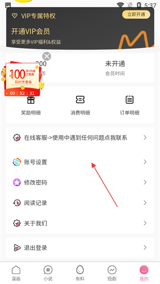 2、在个人中心,可查看【VIP专属特权】【金币】【会员时间】等信息,也可进入【账号设置】页面进行相关设置。