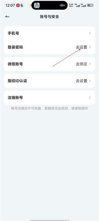 3、在【账号与安全】页,可设置登录密码、绑定微信账号,还能开启指纹ID认证,操作需验证已绑定手机以保障安全。