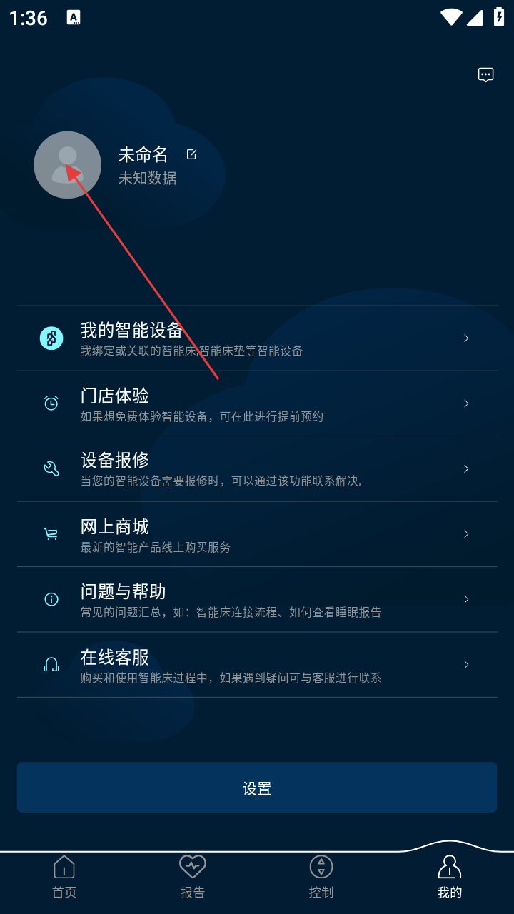 1、打开智慧眠花糖进入应用首页,点击右下角【我的】,进入个人页面。