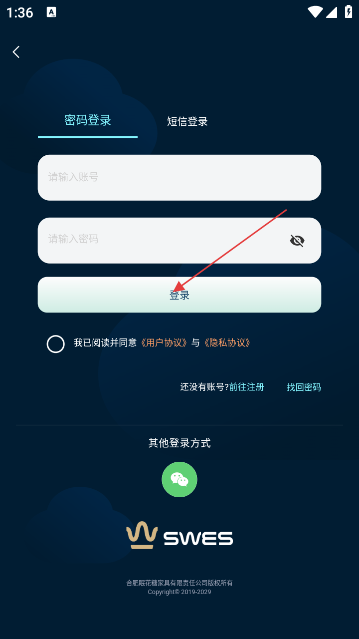 3、在登录界面,选择【密码登录】,输入账号和密码,勾选【我已阅读并同意《用户协议》与《隐私协议》】。