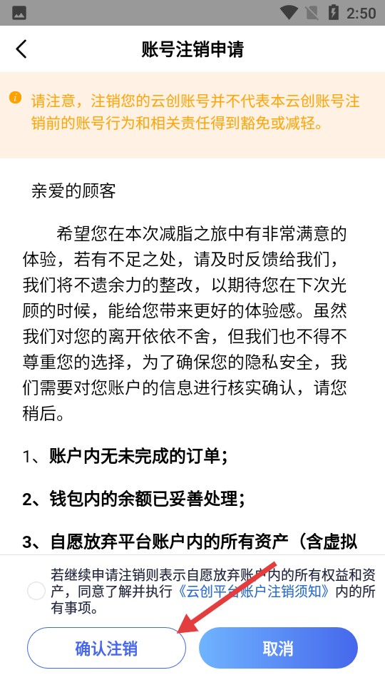 4、在确认账户内不存在未完成的订单,并且钱包余额已得到妥善处理等相关条件都满足后,点击【确认注销】按钮,即可完成账号的注销操作。