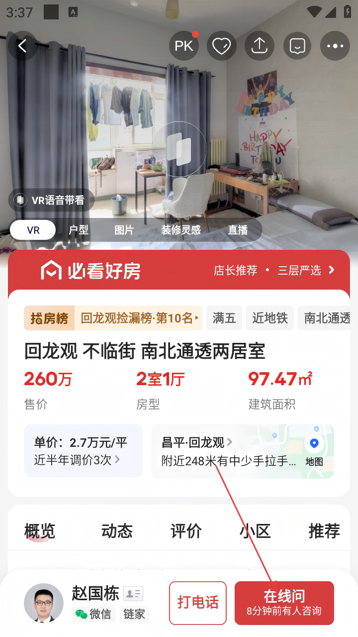 3、在房源详情页,点击【在线问】,进入与经纪人的咨询界面。