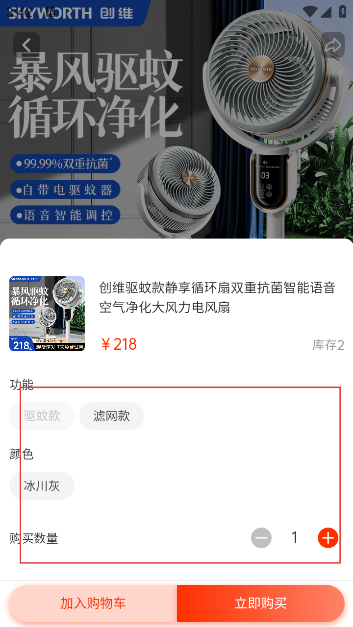 3、在规格页选功能、颜色、数量,点击【立即购买】。