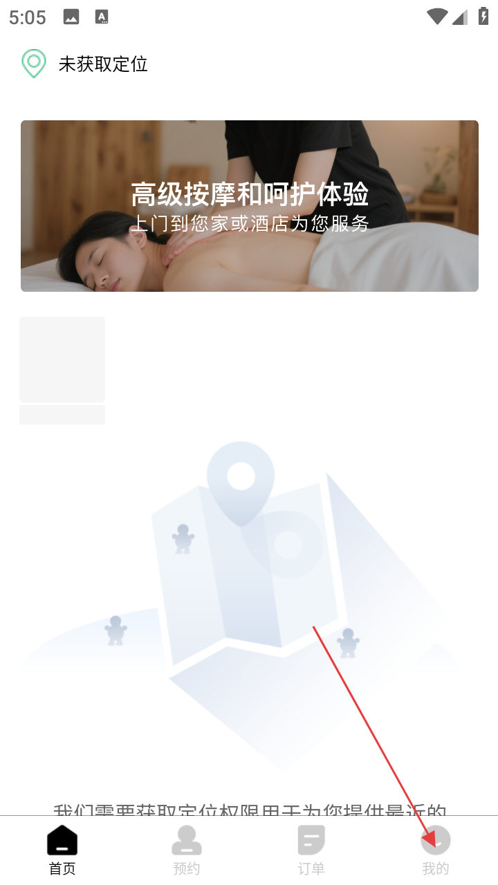 1、打开应用进入首页,在首页了解【高级按摩】服务,点底部【我的】进入个人页。