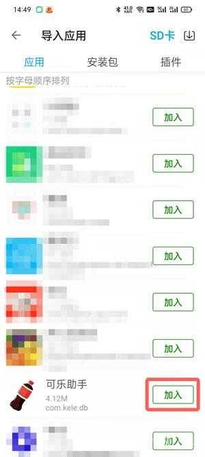 2、若手机里已安装可乐助手,可在对应列表中找到该应用并点击【加入】按钮;要是仅存有安装包,则需通过安装包列表找到后进行加入操作。