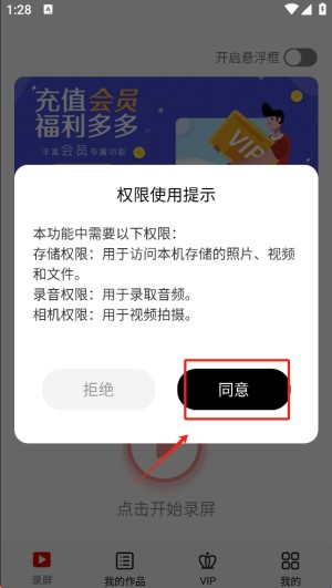 3、点击“同意”按钮,授予应用访问存储、录音和相机权限。