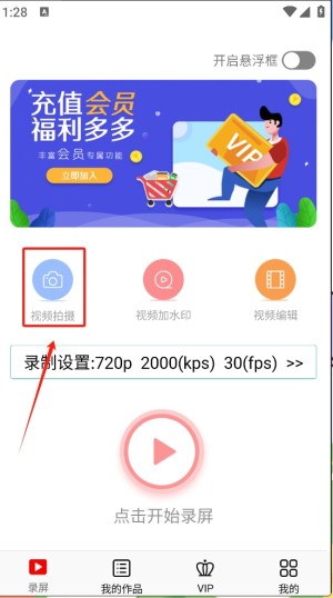 2、点击“视频拍摄”按钮,进入录屏设置界面。