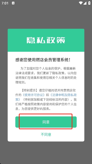 1、首先阅读并同意燃店会员管理系统的隐私政策,点击“同意”按钮继续。这是使用燃店软件的第一步,确保您了解并同意相关条款。