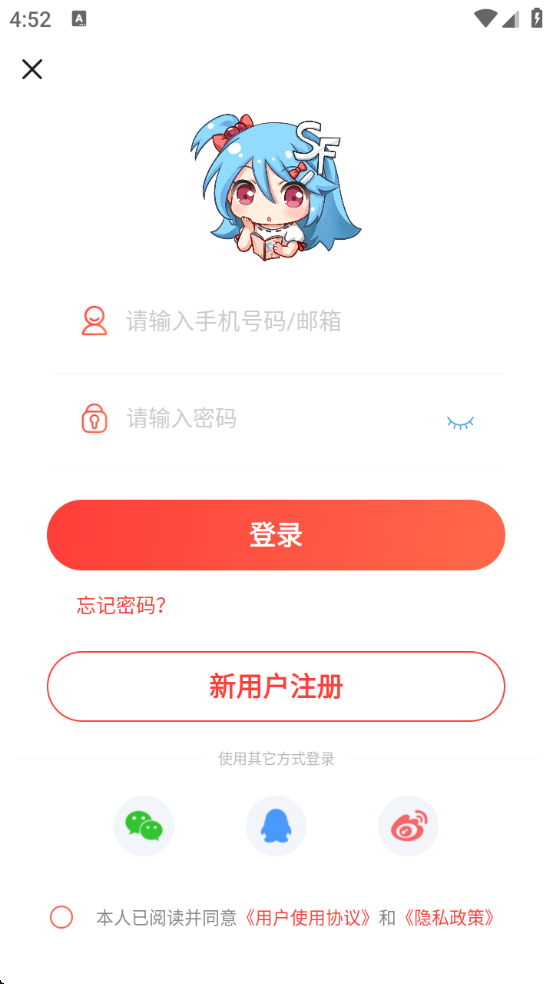 3、在登录界面,可输入手机号码/邮箱和密码登录,也可点击【新用户注册】进行账号注册。