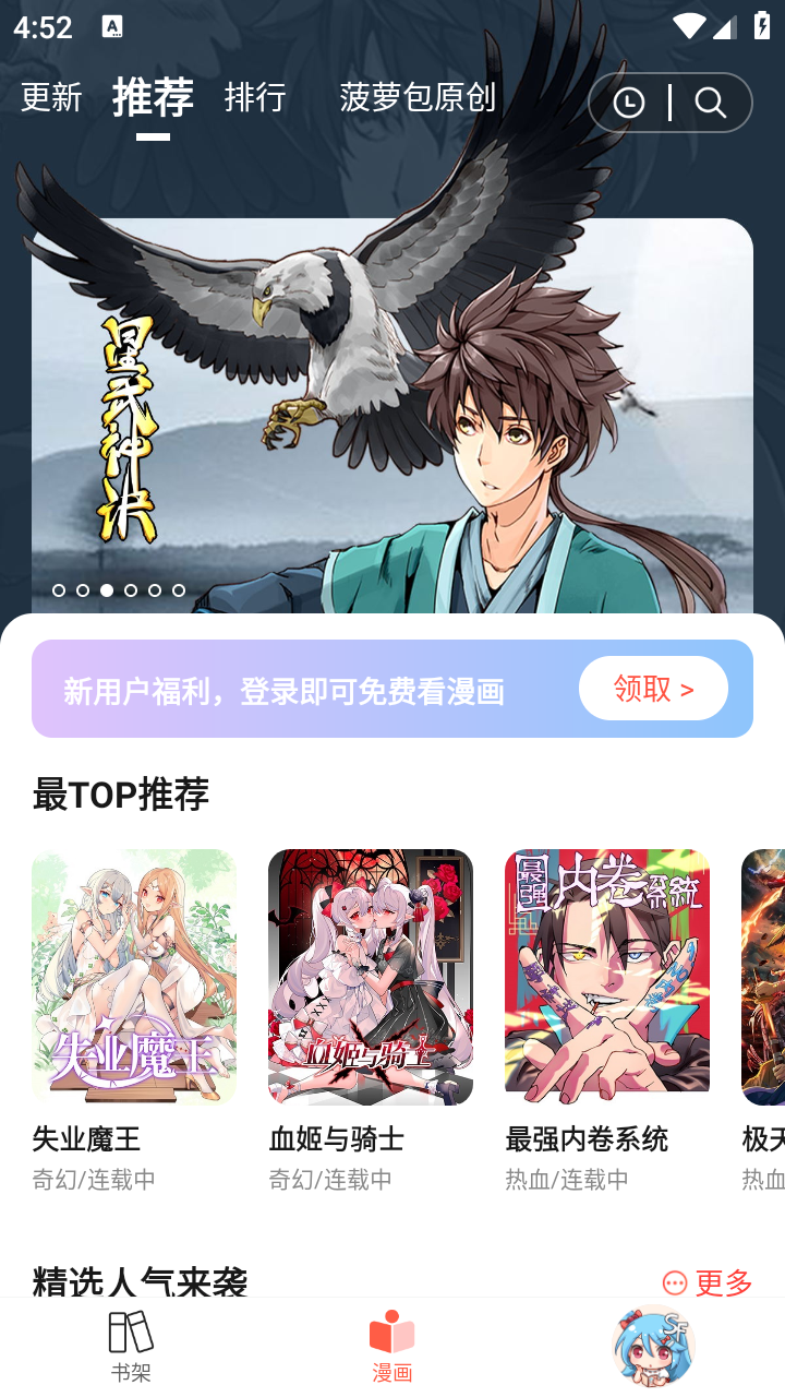 1、在软件首页,可浏览推荐漫画,通过【更新】【排行】等功能找内容,点击右下角个人图标进入个人页面。