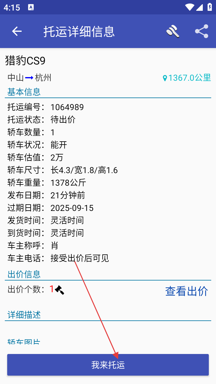 2、在订单列表,选择心仪托运订单,进入【托运详细信息】页查看详情。