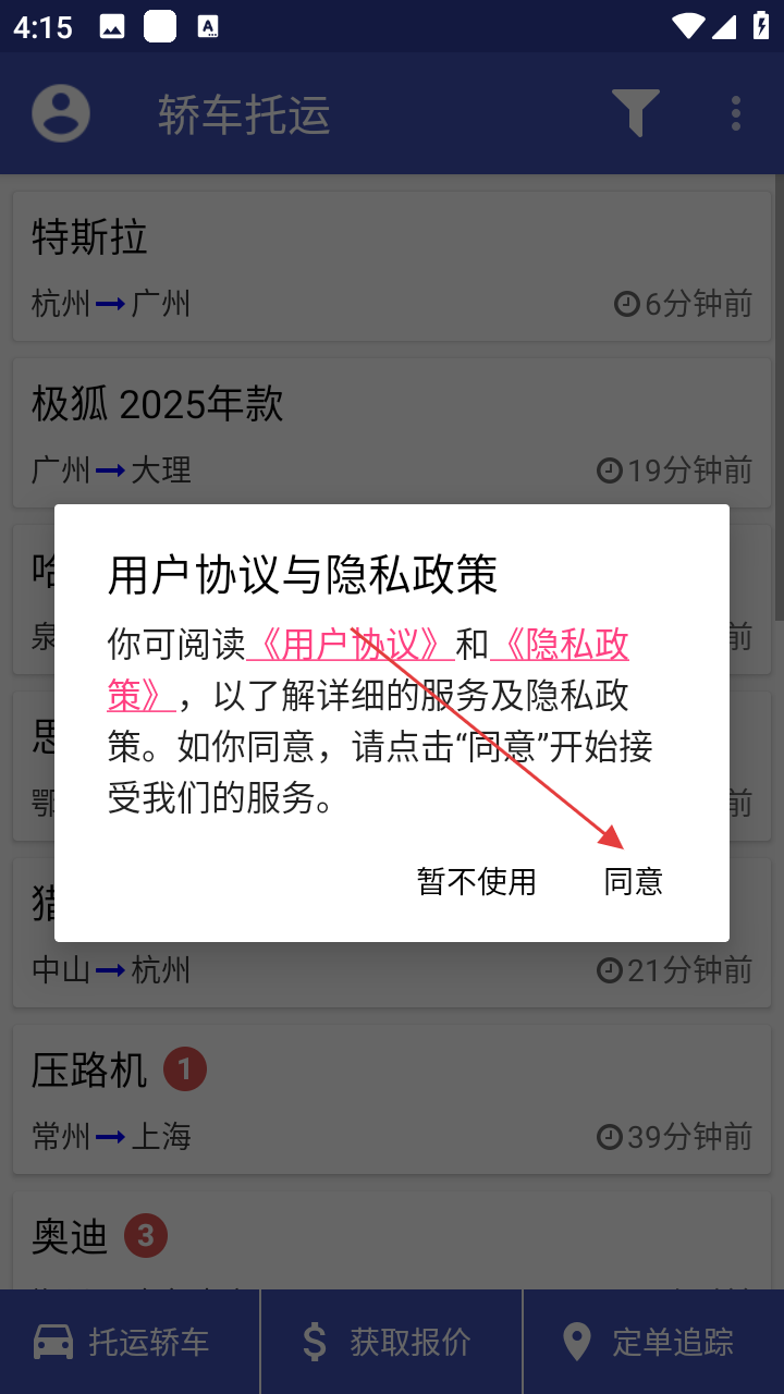 1、打开轿车托运,遇【用户协议与隐私政策】弹窗,点击【同意】继续。