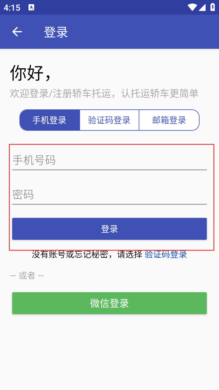 4、跳转至登录页,选登录方式填信息,完成登录即可开展轿车托运业务。