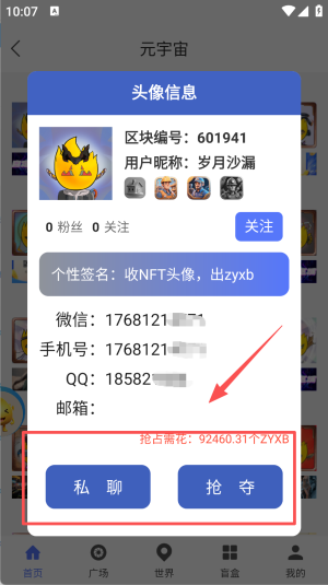 4、打开盲盒页输入92460.31ZYXB,一键抢夺NFT头像再挂私聊售。