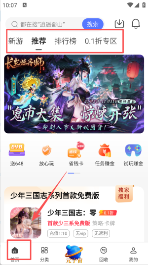 1、在首页搜索框输入“逍遥蜀山”,点击进入0.05折仙侠专题页面。