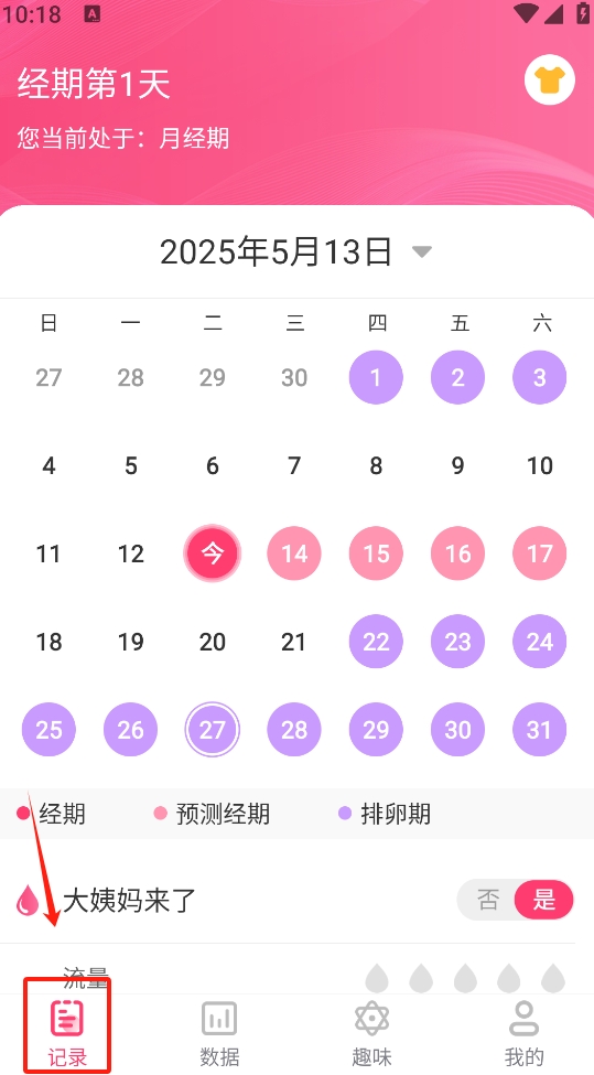 2、点击底部“记录”图标,查看当前经期状态。