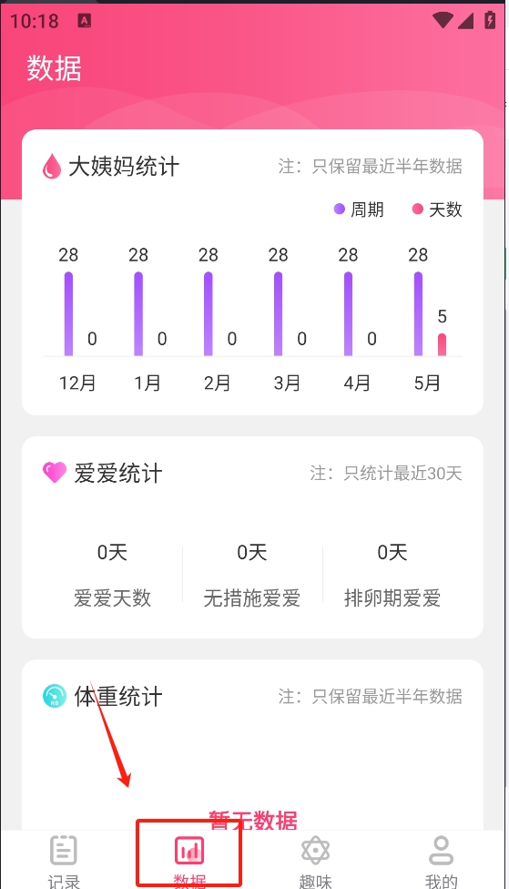 3、点击底部“数据”图标,查看大姨妈、爱爱和体重统计。