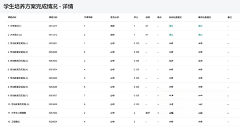 2、在此找到“培养方案完成情况”,可以看到所有科目的考试成绩,分数≥60分或标记为合格即为通过。