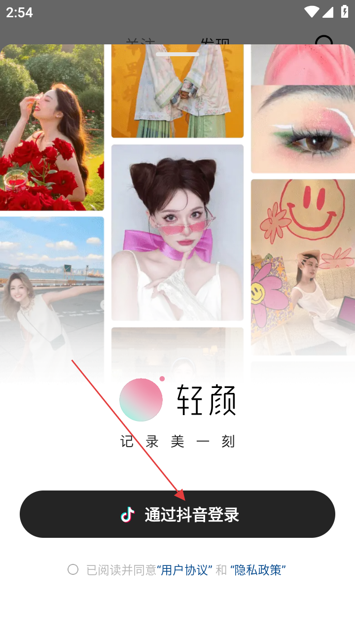 1、在轻颜登录界面,勾选【已阅读并同意“用户协议”和“隐私政策”】后,点击【通过抖音登录】按钮,可登录软件。
