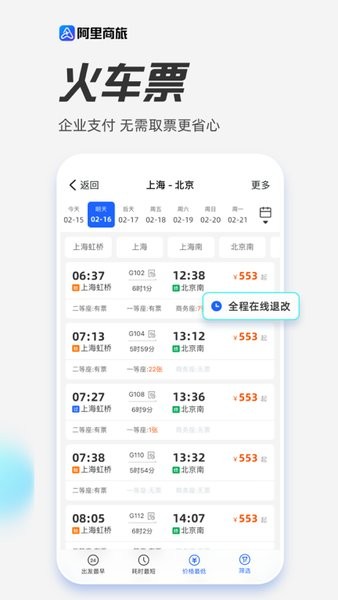 3、火车票统一发售,退改签政策更加灵活,便于用户出差工作。