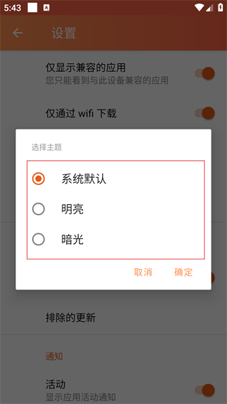 4、点击“主题”可打开选择弹窗,提供【系统默认】【明亮】【暗光】三种主题选项,选择后点击“确定”即可切换应用界面风格。