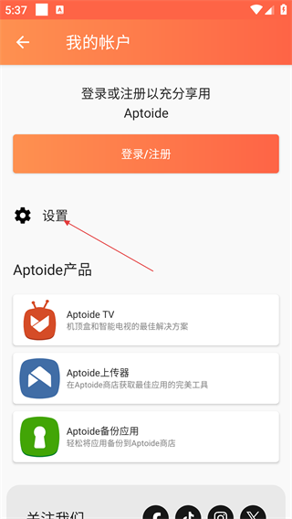 2、进入“我的帐户”页,可通过“设置”入口调整功能,同时能查看Aptoide TV等衍生产品,适配机顶盒、智能电视等设备。