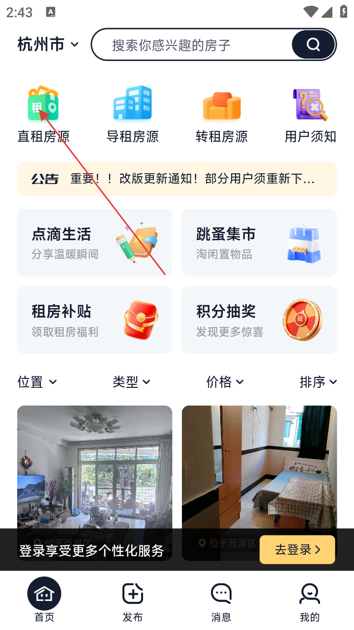 2、进入应用主界面,点击【直租房源】选项,进入直租房源列表页面。