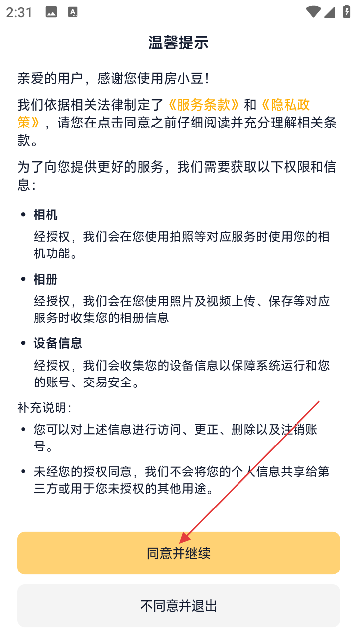 1、打开“房小豆”应用,在弹出的温馨提示界面,点击【同意并继续】。