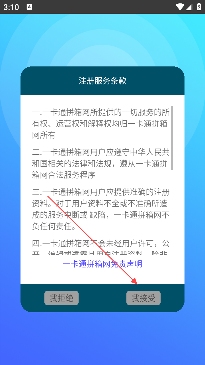 3、进入条款页,点击【我接受】,进入用户注册信息填写页。