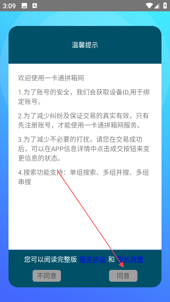 1、打开应用,弹出温馨提示,点【同意】,进入登录注册页。
