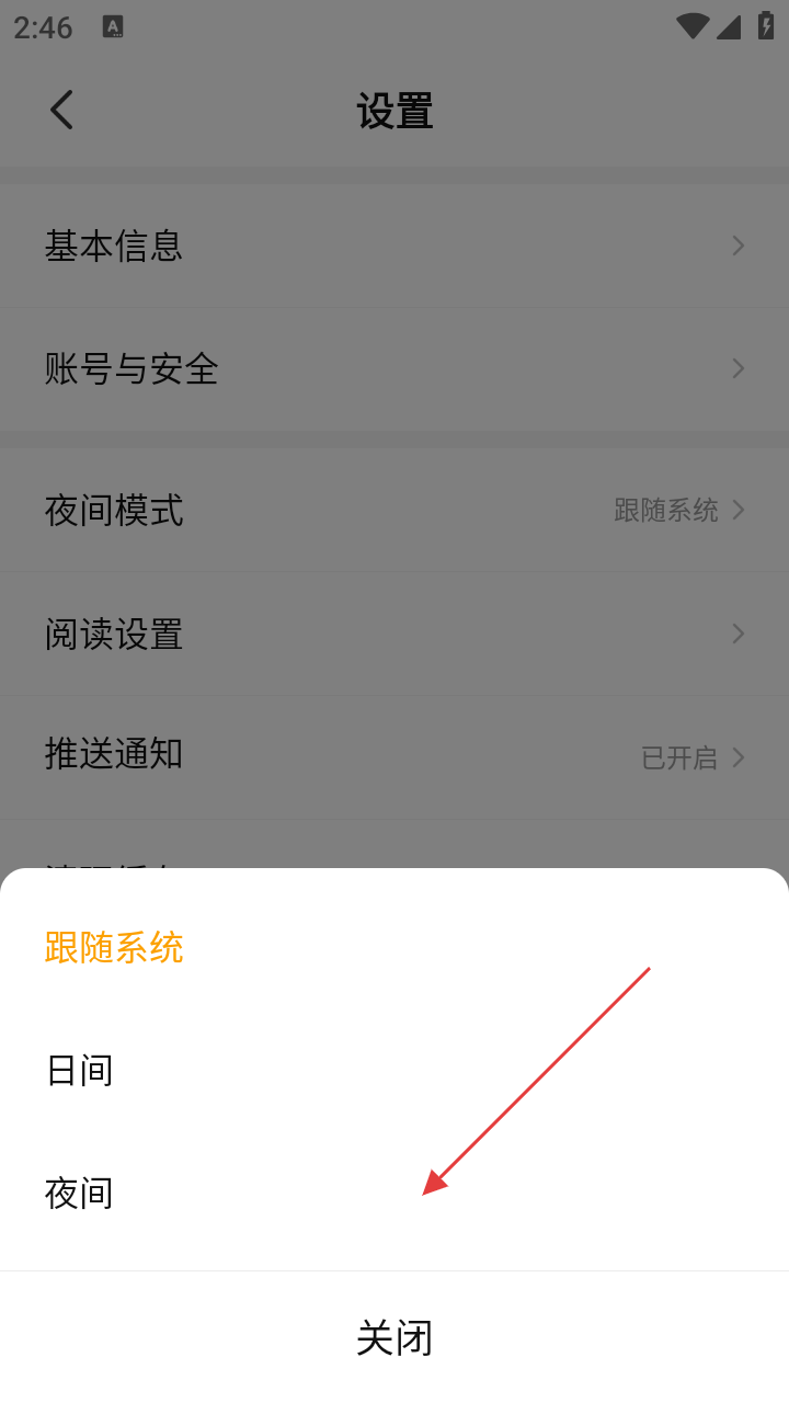 3、在设置界面,找到【夜间模式】选项,点击其右侧的【跟随系统】,弹出模式选择框。