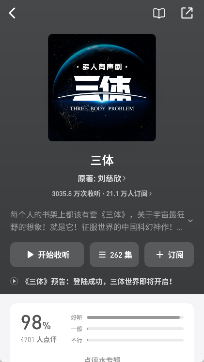 微信听书是微信推出的手机听书应用,能让大家在忙碌生活里通过收听各类有声小说、书籍与音频节目来丰富自我。像文学名著和小说领域,它就收录了不少经典内容,比如《三体》《人类简史》《剑来》这些热门作品。其AI文稿功能十分实用,收听时开启就能同步查看内容文稿。此外,它还支持定时播放和倍速播放功能,方便大家根据自身需求个性化享受有声资源,打造独属于自己的听书体验,不妨来试试吧!