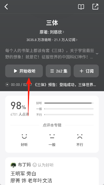 4、在进入播放界面后,点击上方的开始收听按钮即可开始播放。