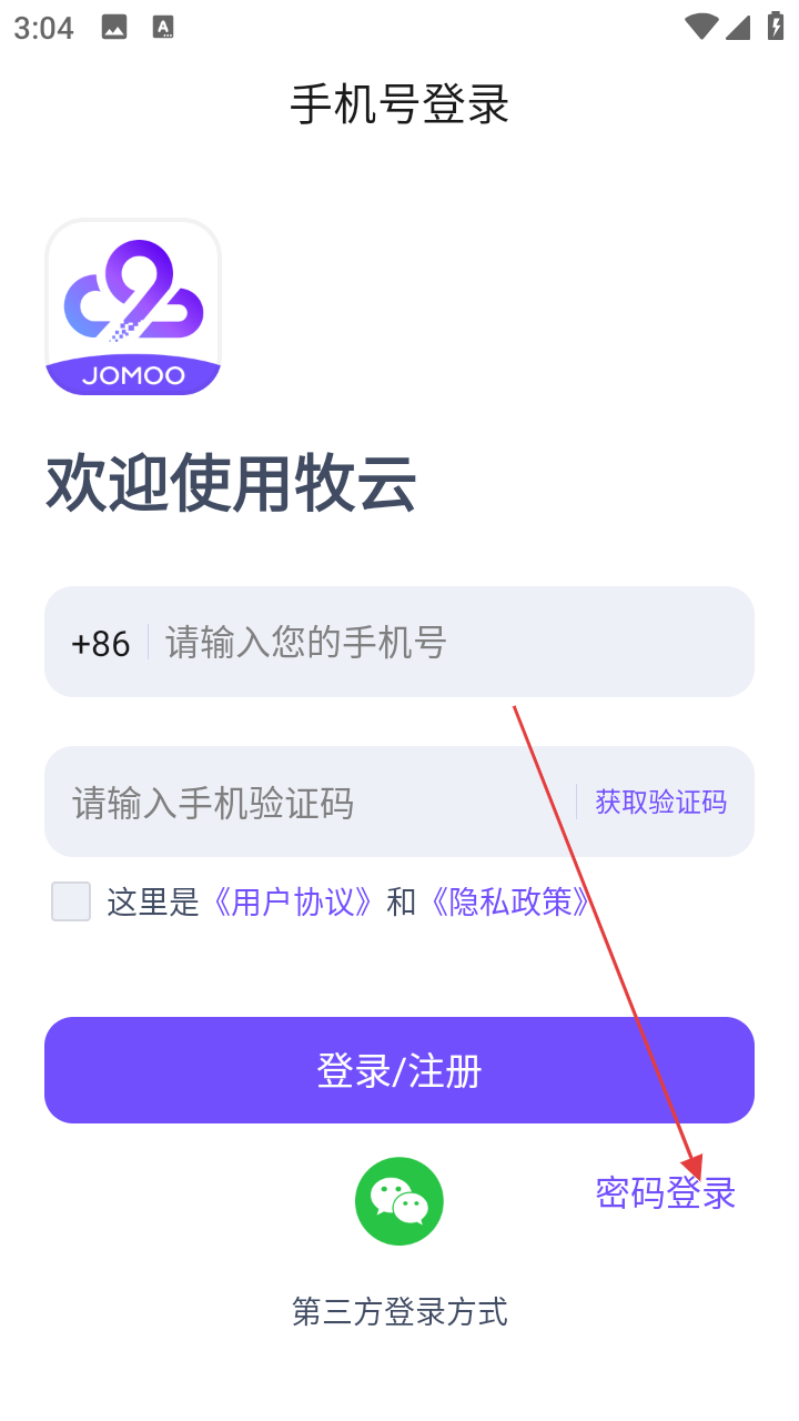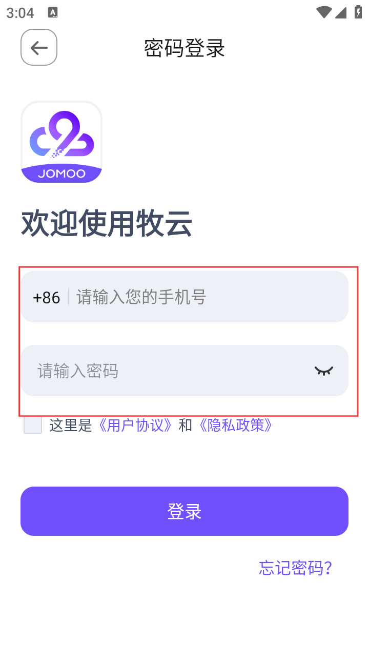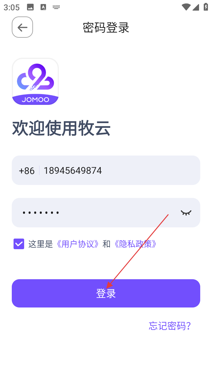 3、在密码登录界面,输入手机号和密码,并勾选“这里是《用户协议》和《隐私政策》”。