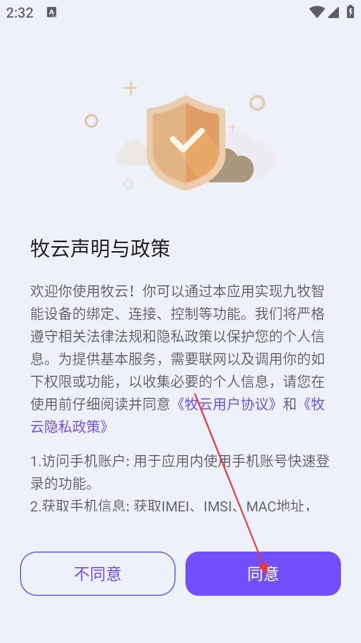 1、打开“牧云”应用,在弹出的“牧云声明与政策”界面,点击【同意】。
