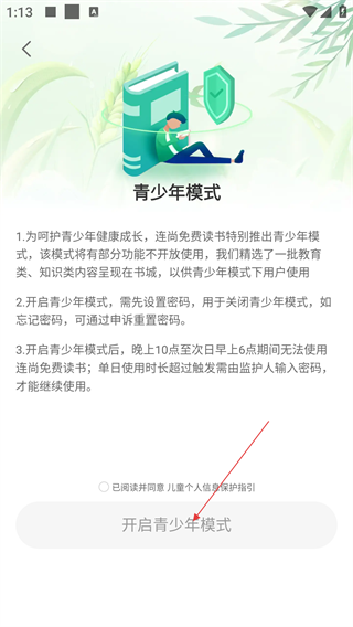 3、在连尚读书设置界面,点击【青少年模式】可进入该模式设置页面,了解模式相关规则。