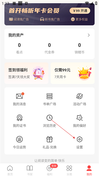 2、在连尚读书APP中,点击底部【我的】选项,可进入个人中心页面,点击【设置】可进入设置界面。