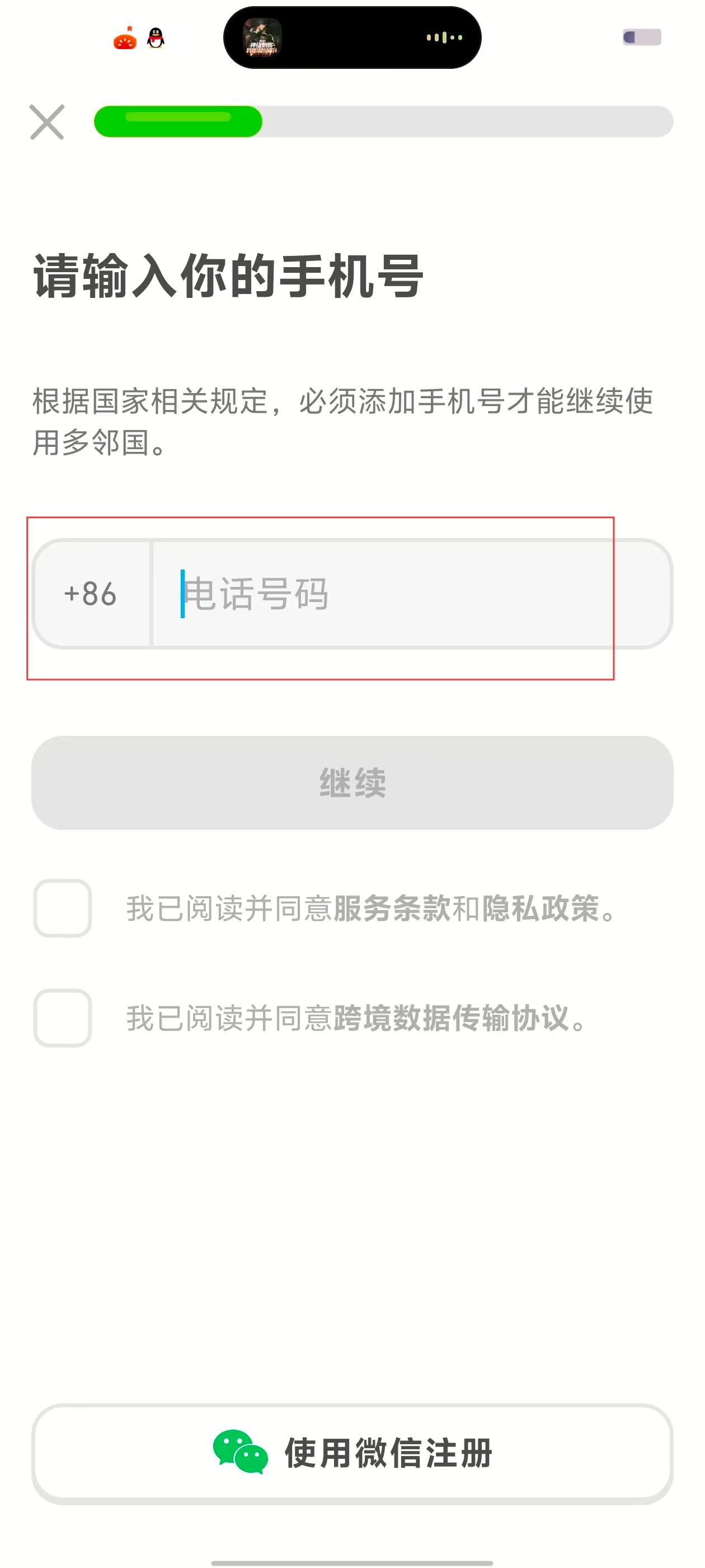 3、进入手机号输入页面,在【+86-电话号码】输入框中,输入要注册的手机号码。