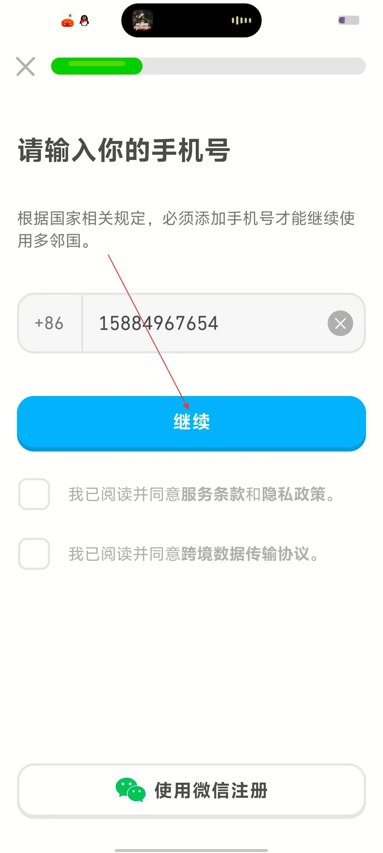 4、输入好手机号后,点击蓝色的【继续】按钮,推进多邻国注册流程。