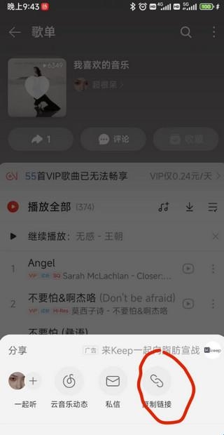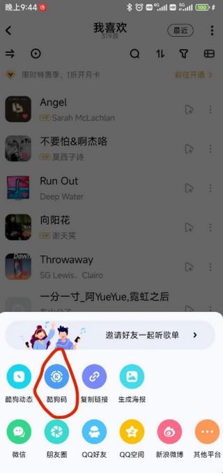 6、在去我的歌单,点击分享,然后复制酷狗码。